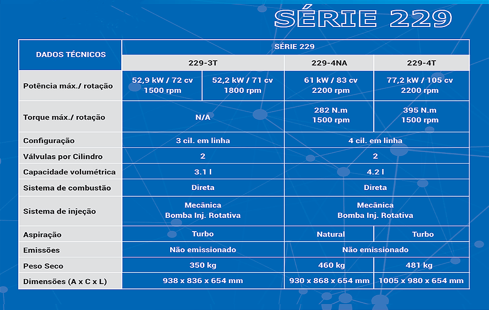 Entre as características principais estão: camisas de cilindro úmidas e desmontáveis, cabeçotes individuais, baixo consumo de combustível, óleo e lubrificante, além de sistemas de injeção mecânica. A potência contínua varia de 50cv (38kW) na versão de 3 cilindros a 182cv (134kW) na versão de 6 cilindros, com torque que varia de 152Nm a 564Nm. A rotação máxima é de 2.500 rpm, com sistema de injeção Bosch e componentes intercambiáveis entre as versões de 3, 4 e 6 cilindros